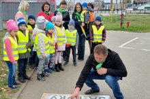 В акции приняли участие 11 детей и 7 взрослых. По пути следования дошкольники вместе со своими родителями на тротуаре перед пешеходным переходом написали призыв "Возьми ребенка за руку!"