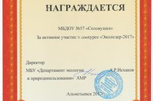 МБДОУ "ЦРР-д/с № 57 "Соловушка" награждается Почетной грамотой МБУ "Департамент экологии и природопользования" АМР за активное участие в конкурсе "Эколидер-2017"
