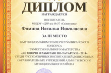 Коллектив ДОУ поздравляет Фомину Наталью Николаевну с теритьим местом в Муниципальном этапе республиканского конкурса профессионального мастерства "Я говорю и работаю по-татарски-2014"