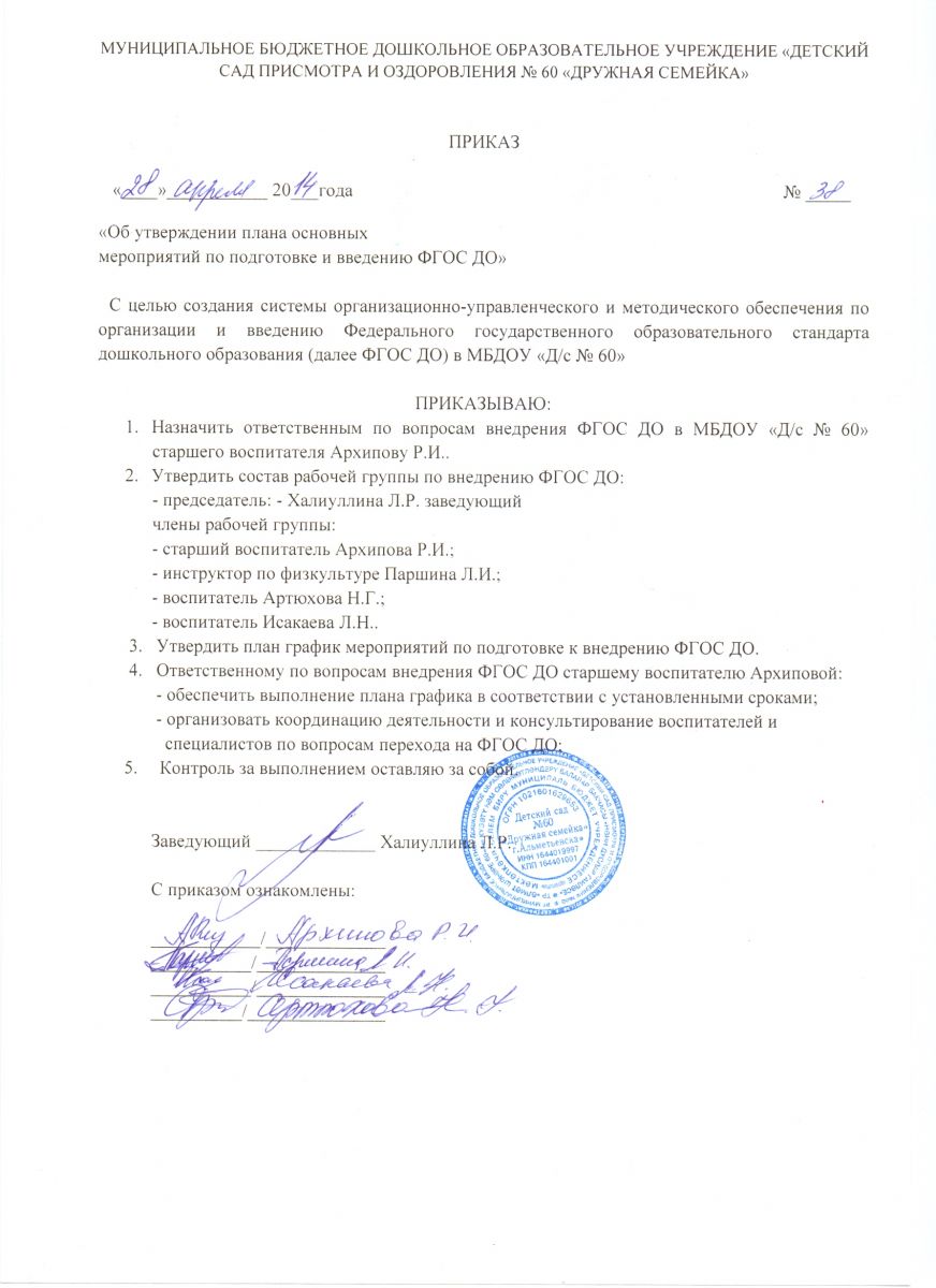 Приказ МБДОУ "Д/С № 60" по внедрению ФГОС ДО