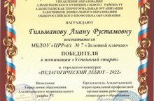 Поздравляем воспитателя Гильманову Лиану Рустамовну с победой в номинации "Успешный старт" в городском конкурсе "Педагогический дебют - 2022".