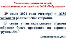 29 июля 2021 года (четверг) в 16.30 состоится родительское собрание. В связи с антиковидными мерами собрание будет проходить на веранде группы №10. Администрация ДОУ