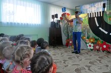 И вновь у нас мастера кукольного театра города Набережные Челны «Семь морей» с представлением «Петрушка и правила дорожного движения». Юные зрители в восторге от моноспектакля – театра одного актера. Всех кукол озвучивает один актер Кондратьев А. Его мастерские постановки, декорации театра поражают юных зрителей. Не смотря на летний период, представление проходит в два захода, все наши воспитанники с удовольствием посещают кукольные представления. Сегодня вместе с героями сказки дошколята повторили в очередной раз правила дорожного движения, как вести себя на дороге, можно ли играть на проезжей части. Повторили знания сигналов светофора, и основные знаки «пешеходный переход», «подземный переход», на которые надо обращать внимание при переходе улицы. И еще раз Петрушка всем напомнил, что дошкольникам переходить дорогу можно только крепко держась за руку с взрослыми. Большое спасибо театру «Семь море» и его руководителю
