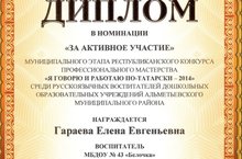 Воспитатель детского сада Гараева Елена Евгеньевна приняла участие в в муниципальном этапе республиканского конкурса "Я разговариваю и работаю по - татарски 2014". Коллектив детского сада и родители поздравляют Елену Евгеньевну с успешным выступлением.
