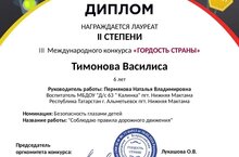 Поздравляем воспитанницу подготовительной группы 1 и воспитателя Пермякову Н.В.с заслуженной наградой. Диплом 2 степени III Международного конкурса "Гордость России", номинация "Безопасность глазами детей".