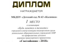 Поздравяем коллектив ДОУ № 63 "Калинка" с победой за 1 место в номинации "Будь заметен в темноте" в городском смотре-конкурсе видеороликов среди ДОУ АМР по профилактике детского дорожно-транспортного травматизма "Светофорик-2018". Огромное спасибо педагогам, родителям, воспитанникам, принявших участие в видеосъемке.