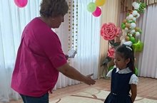 Ежегодно в нашем саду проводится акция "Помоги собраться в школу". Заведующий детского сада поздравила первоклассницу сотрудницы и пожелала успехов в учебе.