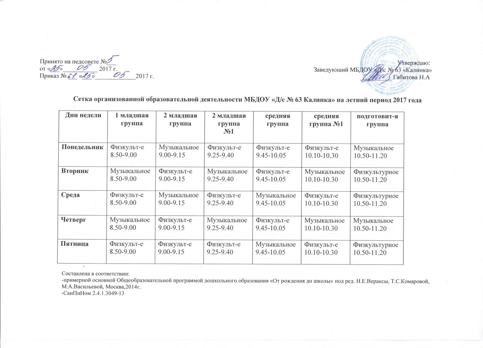 Сетка организованной образовательной деятельности МБДОУ на летний период 2017г.