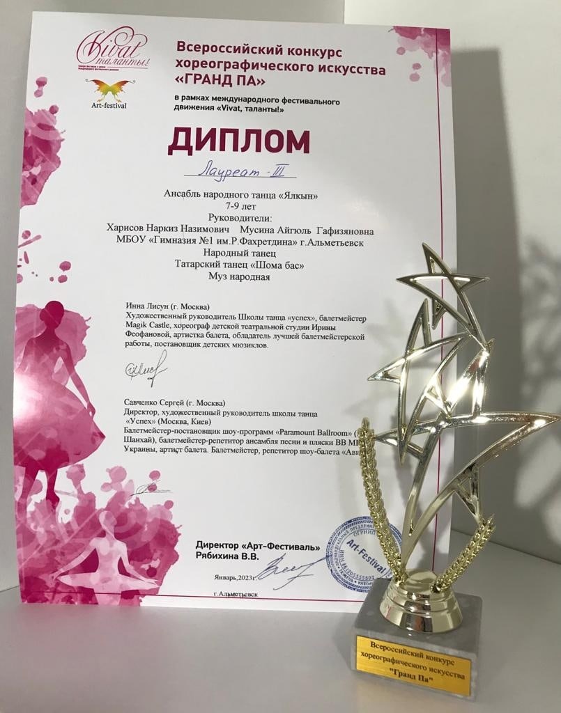 Участие во Всероссийском конкурсе хореографического искусства "ГРАНЖ ПА" ансамбля "Ялкын", где стали Лауреатами II и III степени. Искренне поздравляем руководителей Наркиз Назимовига и Айгюль Гафизяновну.