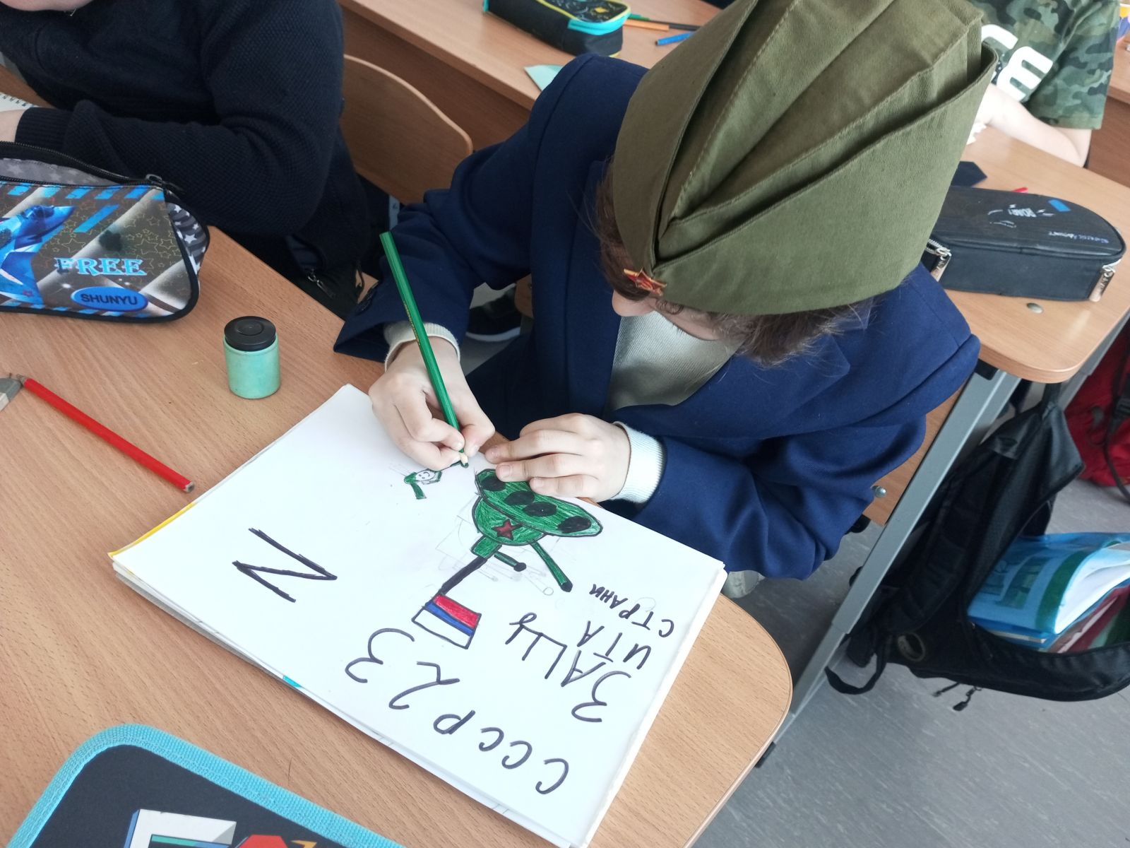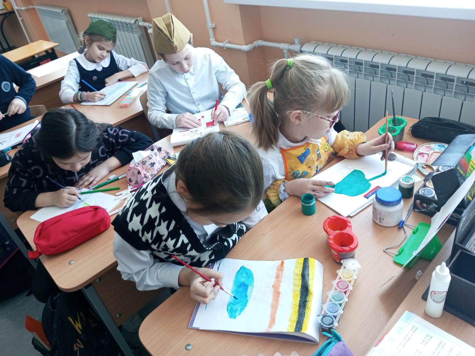 Советник директора по воспитанию Галимова А.С.,провела с учащимися школы акцию "Семейные истории мужества", учащиеся 3 класса рисовали поздравительные открытки и рисунки папам.