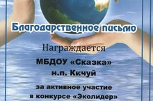 МБДОУ "Сказка" за активное участие в конкурсе "Эколидер"награждены благодарственным письмом