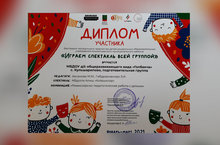 Подготовительная к школе группа награждена дипломом "Участника" в номинации "Режиссёрско-педагогическая работа с детьми" в фестивале театрального творчества детей дошкольных образовательных учреждений Альметьевско муниципального района