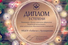 Наш детский сад награжден дипломом 3 степени за участие в конкурсе "Новогодняя сказка" в номинации "Лучшее новогоднее оформление бюджетной организации" среди дошкольных образовательных учреждений.