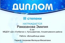 Наша воспитанница подготовительной группы Рамазанова Эмилия награждена дипломом 3 степени в Региональном конкурсе рисунков "Зимы волшебные узоры".