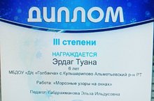 Наша воспитанница подготовительной группы Эрдаг Туана награждена дипломом 3 степени в Региональном конкурсе рисунков "Зимы волшебные узоры".