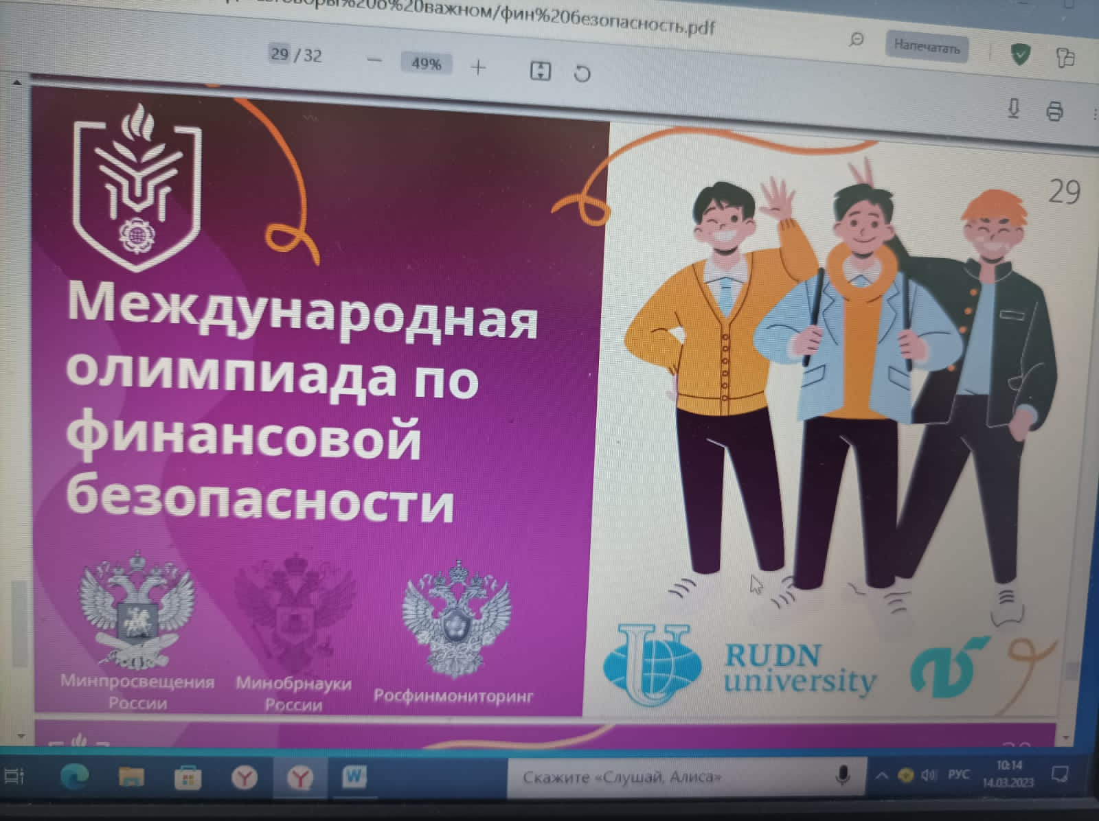 14 марта в МБОУ "Кульшариповская СОШ"прошел тематический урок по теме " Финансовая безопасность личности в сети Интернет " с учащимися 8-10 классов. Урок прошел в формате круглого стола с выполнением тестовых заданий по теме урока. Для повышения знаний о финансовой грамотности предлагаем принять участие в Международной олимпиаде по финансовой безопасности.