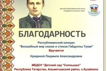 Наш воспитанник Трифонов Олег занял 1 место в Республиканском конкурсе рисунков "Волшебный мир сказок и стихов Габдуллы Тукая" , посвященных творчеству Г.Тукая. Бдлагодарственное письмо было врученно воспитателю Нуждиной Л.А.