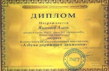 Учащийся 6 (ныне 7) класса нашего лицея – Яманаев Азат (классный руководитель Мамзина В.И.), стал Лауреатом Всероссийской дистанционной (с международным участием) викторины «Азбука дорожного движения», итоги который были подведены к новому учебному году. В викторине приняли участие 343 участника из России и Белоруссии – это учащиеся 1 – 11 классов средних общеобразовательных школ. Сумма набранных баллов 30 (из возможных 32) была набрана нашим участником. Но главное он показал отличный уровень знаний правил дорожного движения, и это очень отрадно. Молодец!