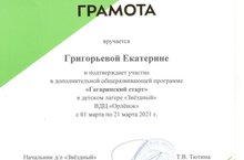 Сегодня прошла встреча учеников 7а класса с Григорьевой Екатериной, ученицей 8а класса, посетившей Всероссийский детский центр «Орлёнок» в марте этого года. Катя рассказала о лагере, учебных занятиях и мероприятиях, в которых она принимала участие. Грамота за участие в дополнительной общеразвивающей программе «Гагаринский старт» и Грамота победителя практико-ориентированной работы «Великие математики» особенно заинтересовали учеников 7 класса.