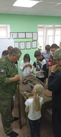 Во время поисковых работ члены отряда находят не только личные вещи солдат, но и оружие, гильзы, патроны, осколки, обломки военной техники и многое другое - все это можно посмотреть в центре "Патриот", куда Евгений Геннадьевич всех приглашает, потому что кроме поисковой деятельности он занимается военно-патриотическим воспитанием молодежи.Ребятам нашего лагеря понравилась экскурсия, они смогли сделать фото с экспонатами, примерить каску, ощутить тяжесть оружия и обмундирования.