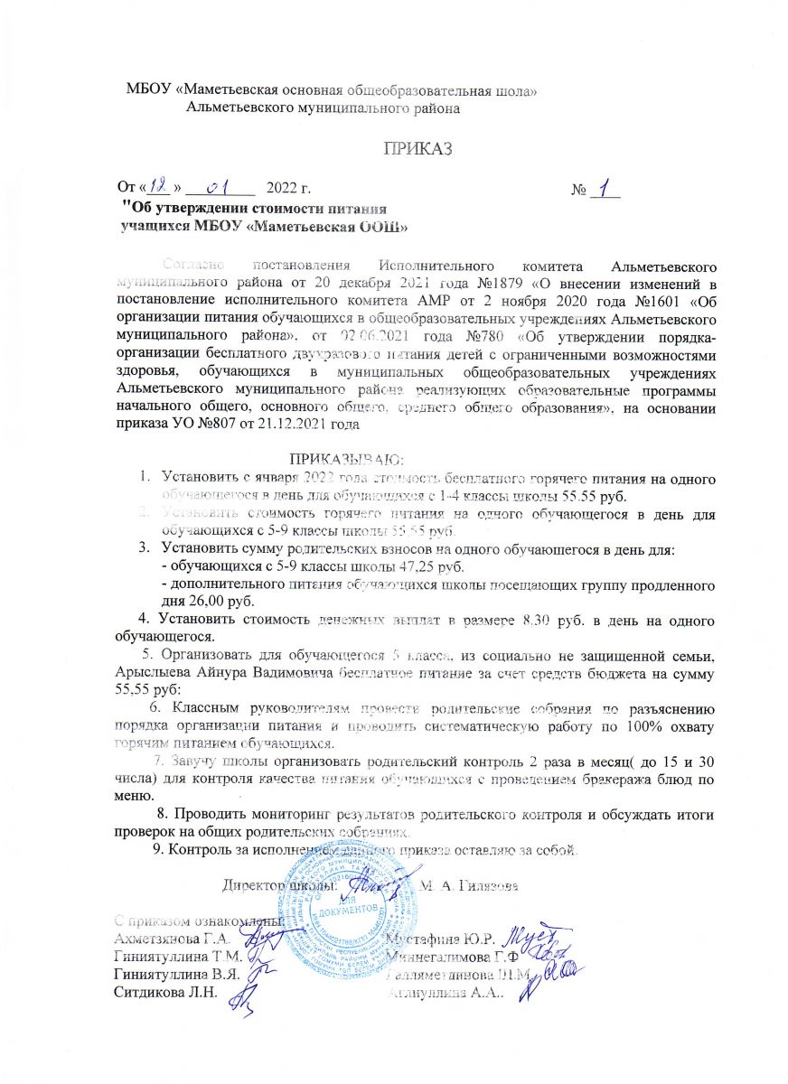 Приказ ОУ №1 от 12_01_2022 Об утверждении стоимости питания