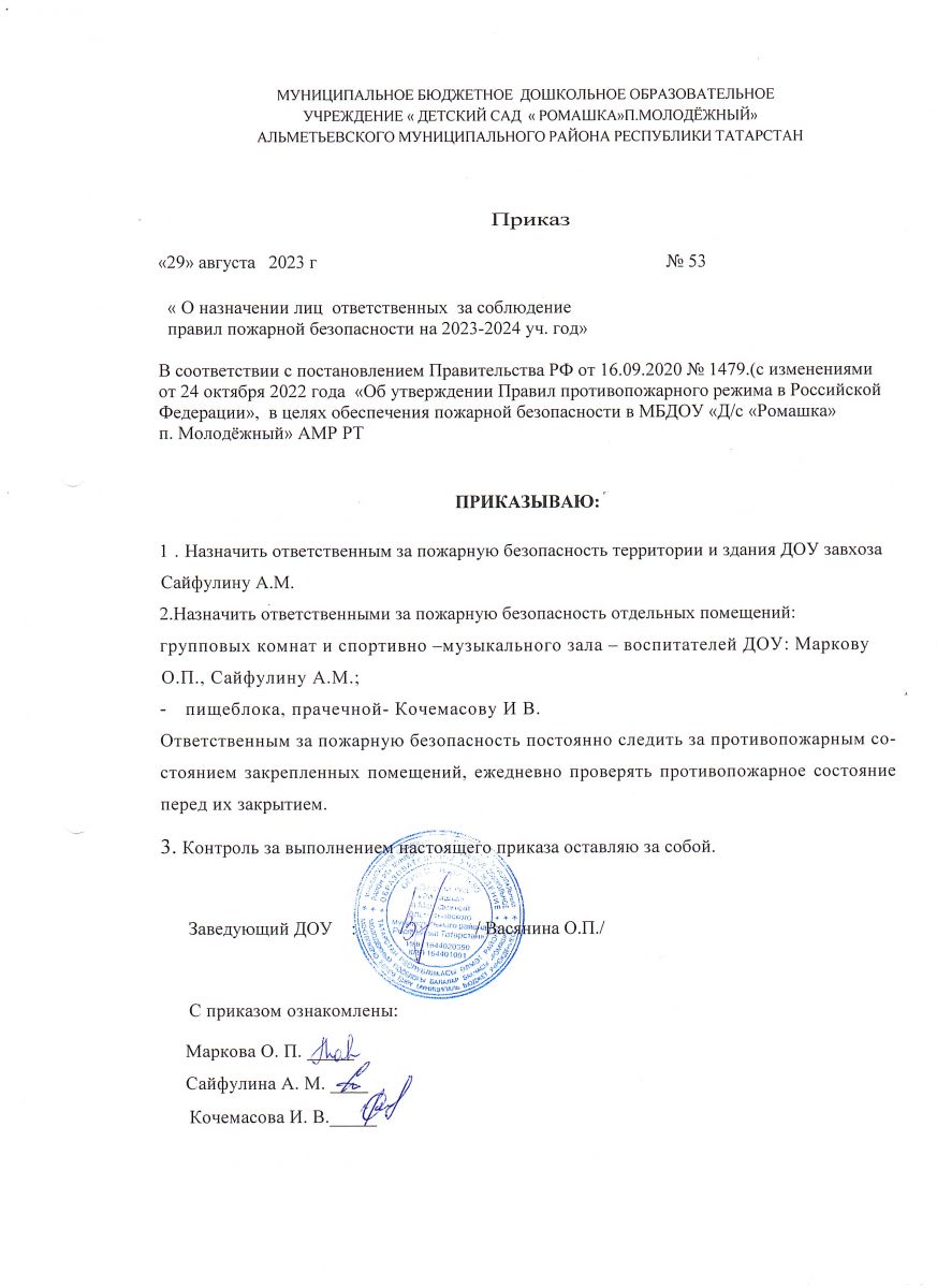 Приказ " Об установлении противопожарного режима в МБДОУ " Д/ с " Ромашка" п. Молодёжный АМР РТ