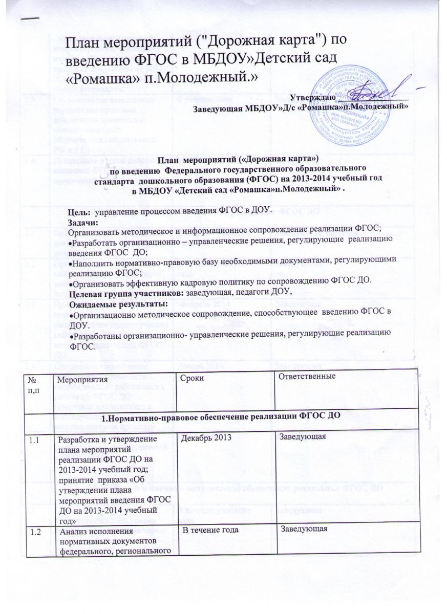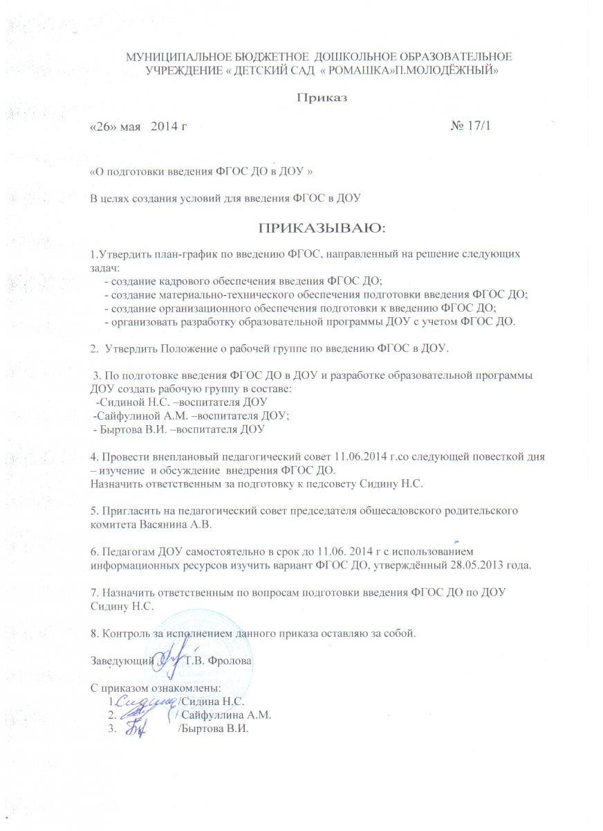 12.3.2. Приказ ДОУ об утверждении Плана мероприятий введения («Дорожной карты») ФГОС ДО
