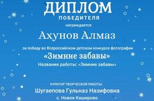 Диплом победителя.Ахунов Алмаз, ученик 3 класса. Всероссийский детский конкурс фотографий "Зимние забавы" (Куратор творческой работы: Шугаепова Г.Н.)