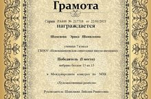 "ТАТАР СҮЗ" бәйгесендә катнашканы өчен 5 нче сыйныф укучысы Әхмәдуллина Илсинә Илмир кызы Рәхмәт хаты белән бүләкләнә. (Җитәкчесе: Салихова Г.А.)