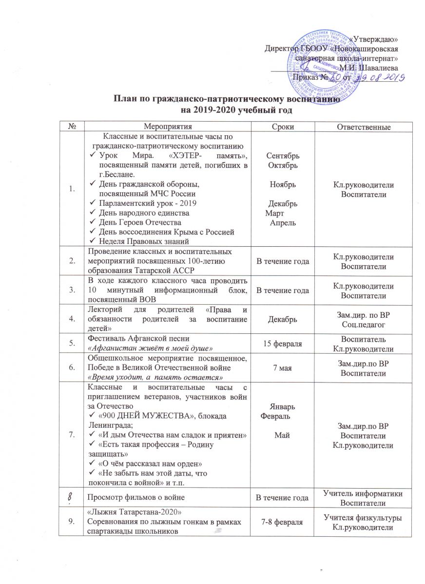 План по гражданско-патриотическому воспитанию на 2019-2020 учебный год / 2019-2020 уку елына гражданлык-патриотик тәрбия бирү планы