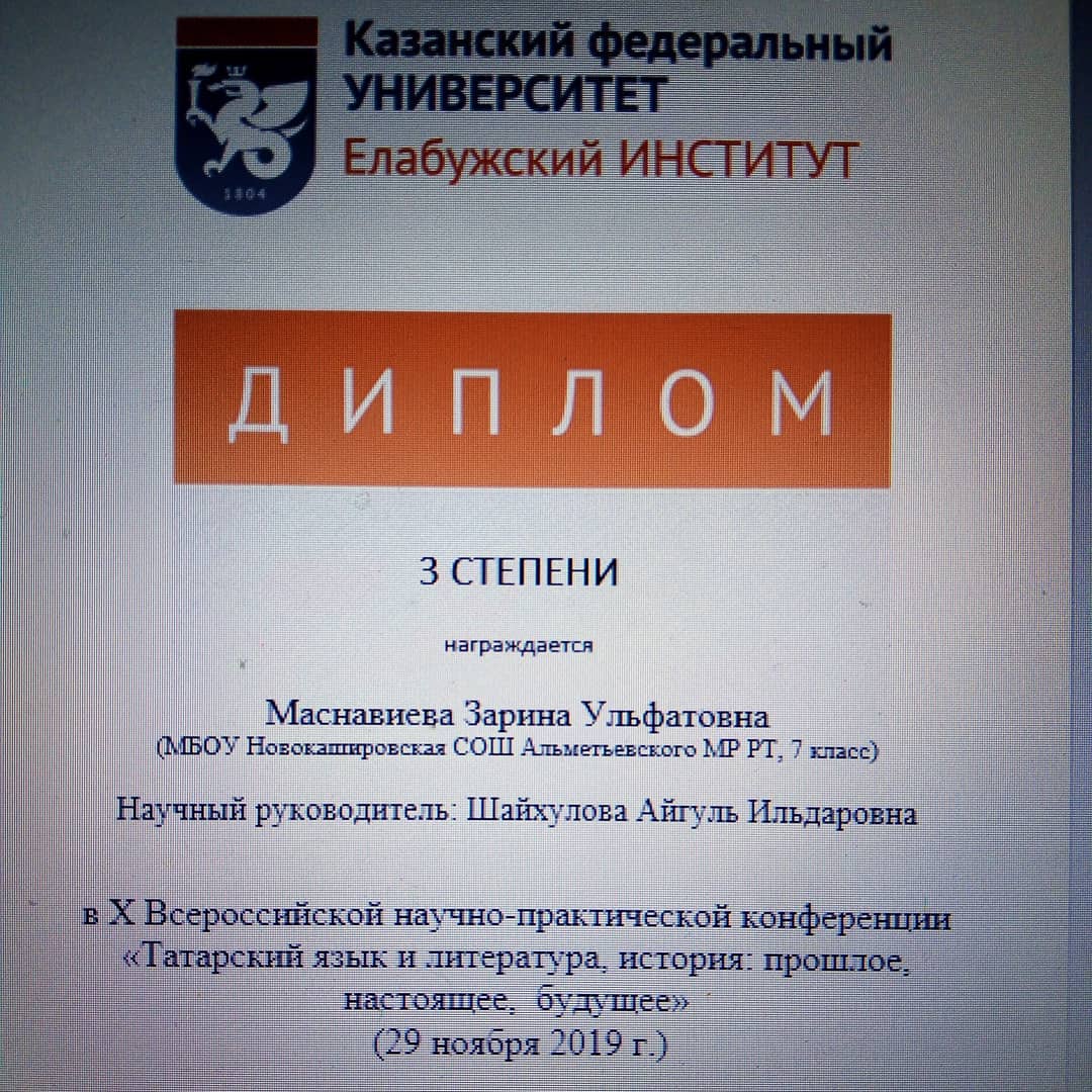 29 ноября ученики МБОУ "Новокашировская СОШ" приняли участие во Всероссийской научно-практической конференции в г. Елабуга. По итогам конференции Ортыкхолова Диана заняла 2 место по истории (научный руководитель: Валеева Г. Г.), а Маснавиева Зарина 3 место по татарской литературе (научный руководитель: Шайхулова А.И.)