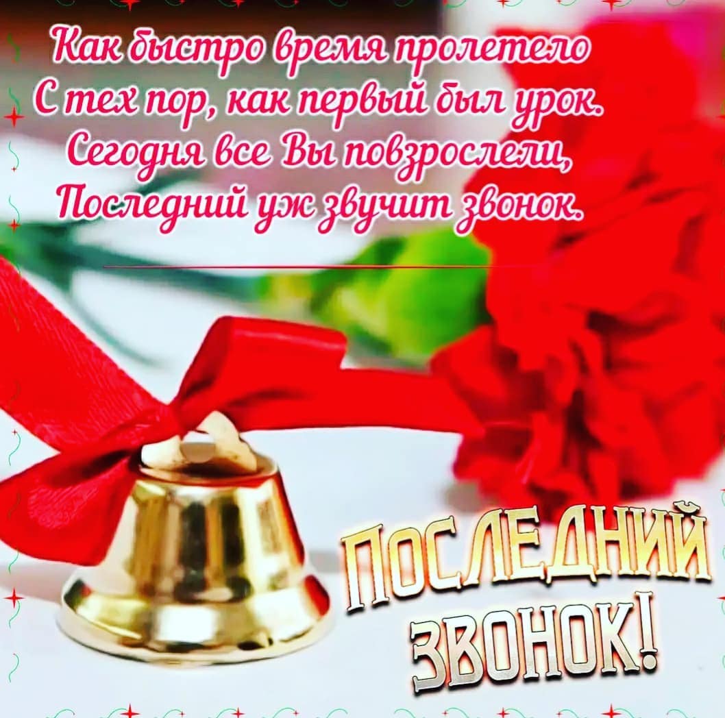 Дорогие выпускники! Сегодня для вас прозвенел Последний школьный звонок! Для вас начинается новая жизнь, полная ответственности и обдуманных решений. Теперь от вас зависит не только ваша жизнь, но и будущее нашей страны. Возможно именно сегодня Школа прощается с учениками, среди которых находятся будущие кандидаты наук, политики, педагоги и квалифицированные врачи. Смело достигайте новых вершин и реализуйте свои желания!