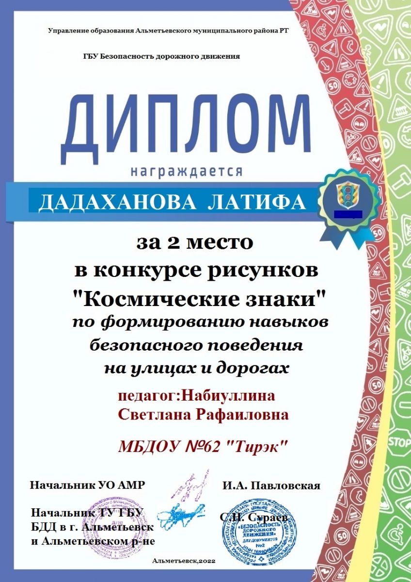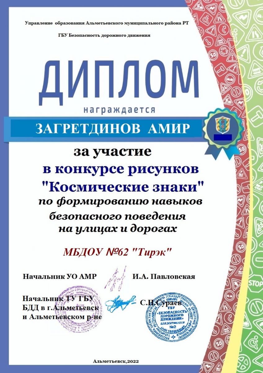 Космические знаки 12.05.2022Воспитанники подготовительной группы (Дадаханова Латифа и Загретдинов Амир) участвовали в городском конкурсе рисунков "Космические знаки" по формированию навыков безопасного поведения на улицах и дорогах. По итогам конкурса Дадаханова Латифа заняла 2 место.
