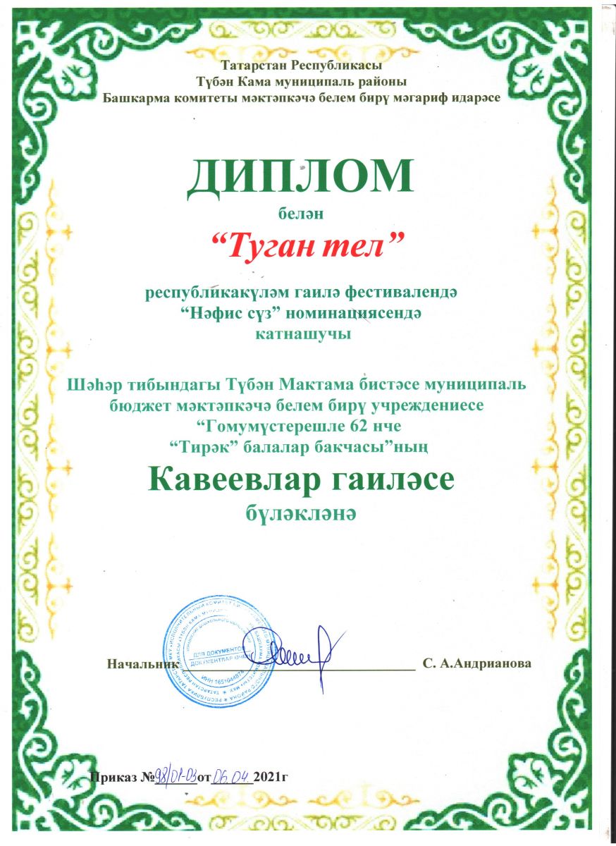 Туган тел 06.04.2021Кавеевлар гаиләсе "Туган тел" республикакүләм гаилә фестивалендә "Нәфис сүз" номинациясендә диплом белән бүләкләнделәр. Без аларны чын күңелдән тәбрик итәбез!