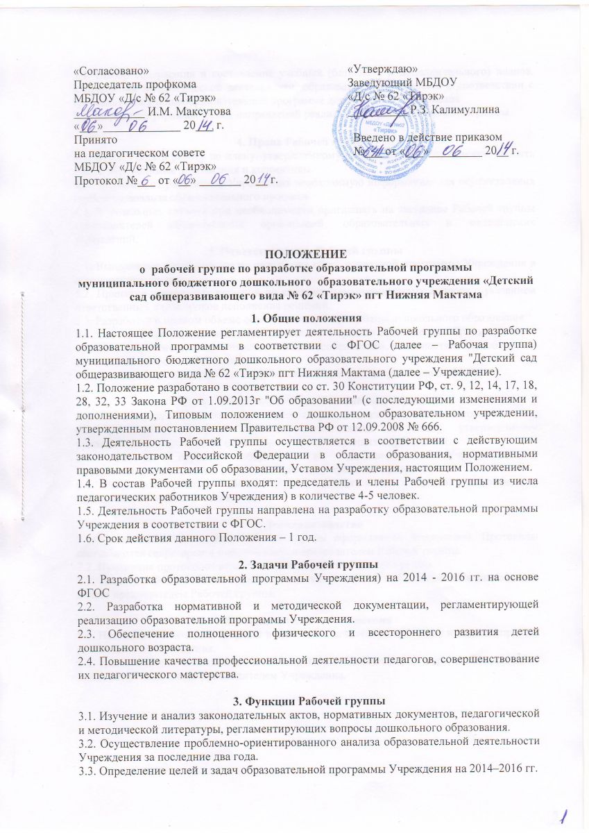 - Положение о рабочей группе по разработке образовательной программы МБДОУ "Д/с № 62 "Тирэк"