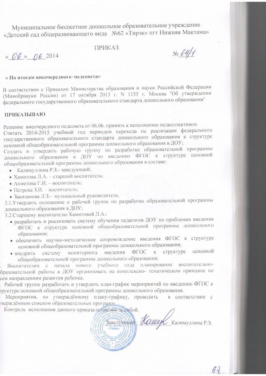 - Приказ "Об организации работы по внедрению ФГОС ДО"