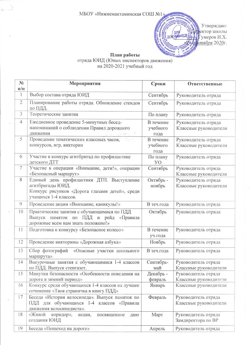 План работы ЮИД на 2020-2021 учебный год