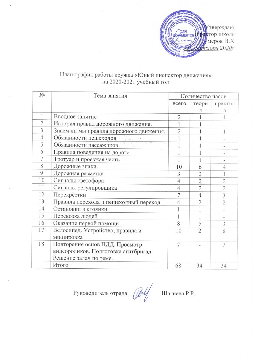 План-график работы кружка "Юный инспектор движения" на 2020-2021 учебный год