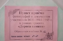 В рамках проекта "ДОРОГА ПАМЯТИ" в нашей школе работает ПУНКТ ПРИЕМА фотографий и документов участников Великой Отечественной аойны 1941-1945 г.г.