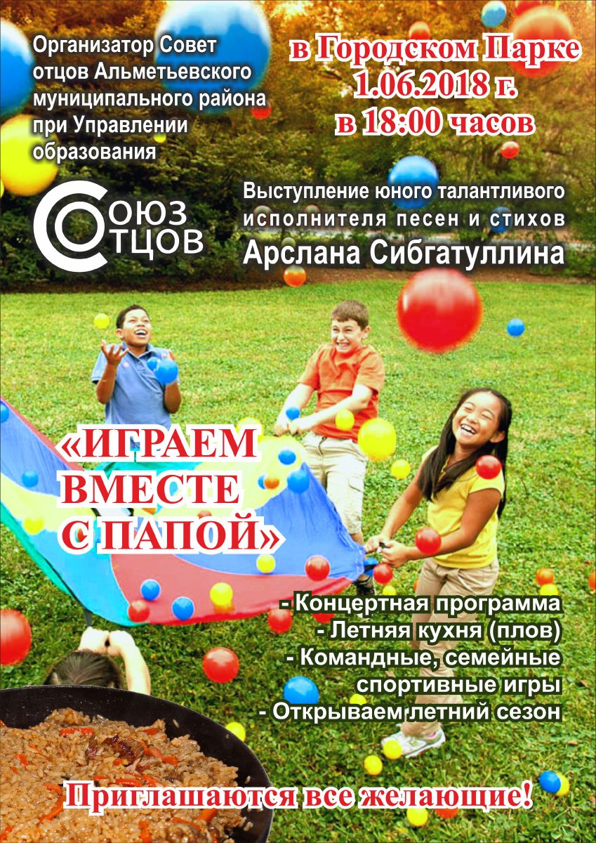 1 июня 2018 года в 18:00 часов в Городском парке состоится праздничное мероприятие, посвященное Дню Защиты детей "Играем вместе с папой". Организатором мероприятия является Совет отцов Альметьевского муниципального района при Управлении образования.
