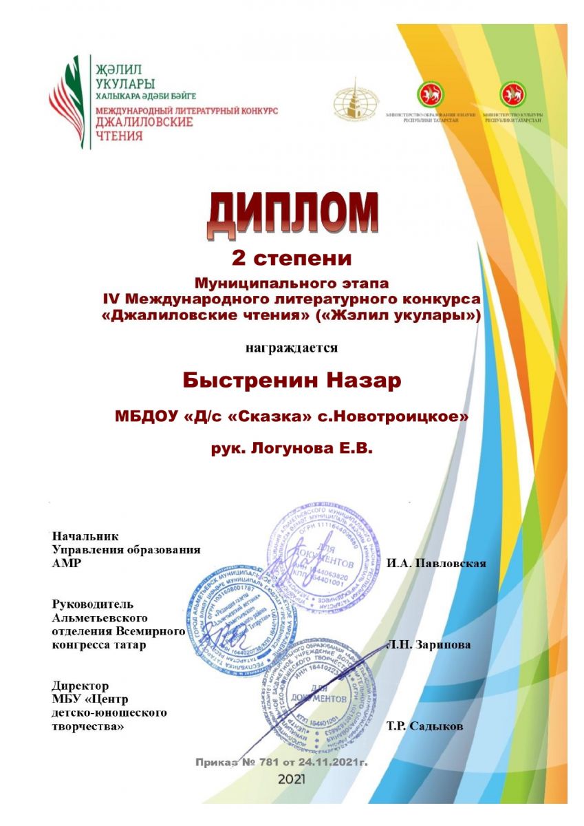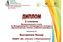 Воспитанник старшей разновозрастной группы Быстренин Назар стал призером муниципального этапа международного конкурса "Джалиловские чтения". Поздравляем!!!
