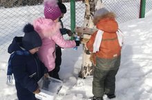 На протяжении всей зимы наши воспитанники подкармливают птиц, которые прилетают в наш сад. Раскладывают в кормушки корм, крошки, семечки. Детям очень нравится эта процедура, а потом они с большим интересом наблюдают за тем, как птицы прилетают к кормушкам и клюют угощения.