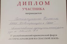 18 октября прошел IV республиканский краеведческий форум "Встреча краеведов на Спасской земле", наша ученица 10 класса Гатиятуллина Камилла приняла активное участие в форуме и награждена дипломом.