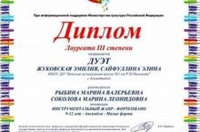 Фортепианный дуэт Жуковская Эмилия и Сайфуллина Элина (преп.Рыбина М.В., Соколова М.Л.) завоевали звания лауреатов Международного конкурса "Осеннее сварожье", и Международного интернет-конкурса "Души прекрасные порывы"