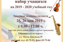 Детская музыкальная школа объявляет прием на 2019-2020 учебный год. 25 и 26 мая с 9.00 до 12.00 состоятся приемные экзамены по адресу ул. М. Джалиля, 19. При себе иметь свидетельство о рождении.