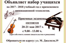 Детская музыкальная школа объявляет набор на 2017-2018 учебный год. 20 и 21 мая с 9.00 до 13.00 состоятся приемные экзамены по адресу ул.Джалиля 19. При себе иметь свидетельство о рождении.