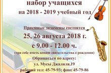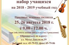 Детская музыкальная школа объявляет дополнительный прием на 2018-2019 учебный год. 25 и 26 августа с 9.00 до 12.00 состоятся приемные экзамены по адресу ул. М. Джалиля, 19. При себе иметь копию свидетельства о рождении.