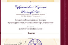 Преподаватель теоретических дисциплин Ефремова Ирина Ралифовна представила свою разработку на Всероссийском дистанционном конкурсе "Дополнительное образование XXI века" и была награждена Дипломом 2 степени. Поздравляем и желаем дальнейших творческих побед!!!