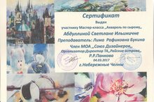 4 марта 2017 года в городе Набережные Челны в Камском институте искусства и дизайна преподавателем, членом МОА"Союз дизайнеров" : Лимой Рафиковной Букиной был проведен мастер-класс "Акварель по сырому" где преподаватель Абдуллина Светлана Ильинична и ее учащиеся в количестве 31 человек, приняли активное участие