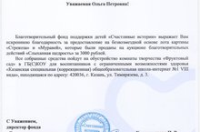Благотворительный фонд поддержки детей "Счастливые истории" выражает благодарность преподавателю Шабаловой Ольге Петровне за предоставление на безвозмездной основе лота картины "Стрекоза" и "Муравей", которые были проданы на аукционе благотворительных действий "слыханная щедрость". Все собранные средства пошли на обустройство комнаты творчества "Фруктовый сад" в ГБ(С)КОУ для воспитанников с ограниченными возможностями здоровья, в городе Казань